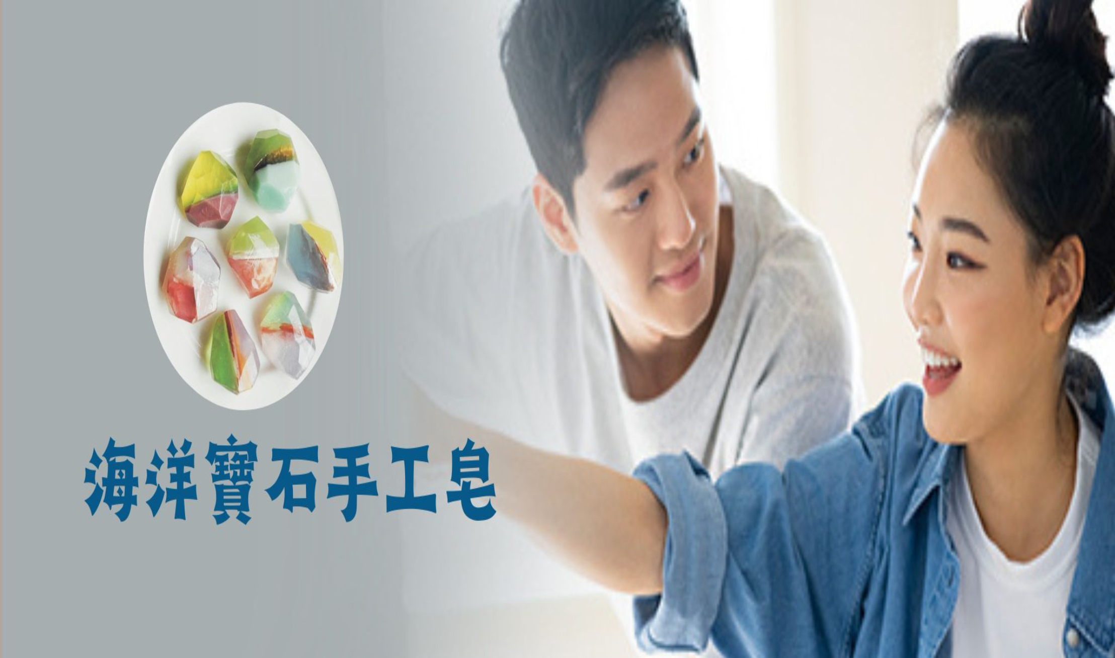 手作海洋寶石手工皂,寶石形狀非常討喜,在專業的老師帶領下,協助學員做出專屬的手工皂,男女兩兩一組,可以看出對方的細心體貼。