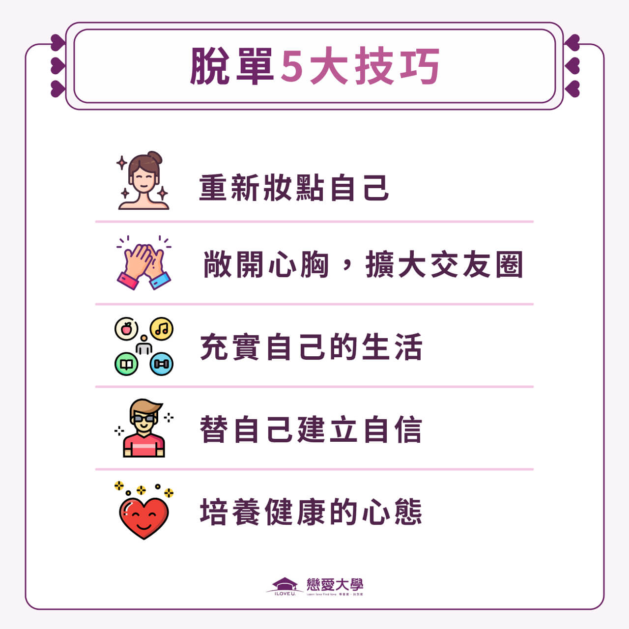 看完以上的分析後,你知道該怎麼脫單了嗎?以下將分享5個幫助你脫單的小訣竅,只要Follow這些脫單指南,包準讓你桃花運爆棚!