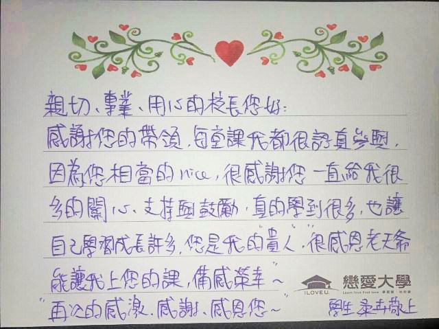 謝謝校長精心安排,設計這麽好的課程。 對於剛分手的我,在這六堂課的學習中,或多或少看見了以前交住時看不見的問題。雖然不敢保證末來不會再犯,但是我已經找到了正確的方向,知道該如何練習和調整,成為一個更好的男人,盼望未來校長還能開設更多類似成長進修的課程!(單身必修六堂課)