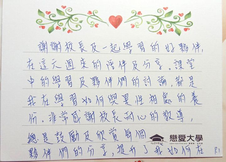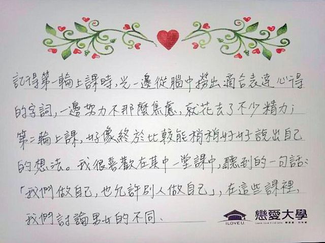 課程中不斷發現自己的不足、不斷的修正自己固有的想法,進而了解男女大不同的差異,不管你是否單身,都建議你或帶另一伴來戀愛大學上這堂「擁抱珍愛-情侶夫妻必修課」,為你的人生幸福加分!學費CP值真的超高!現在小小投資,未來人生甜滋滋!